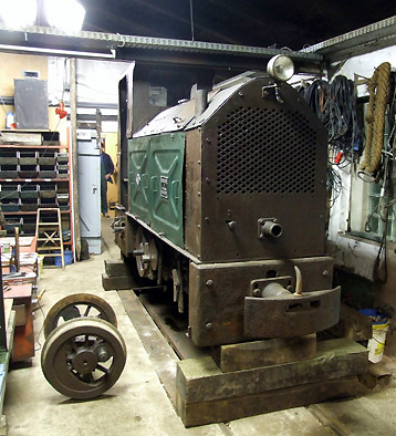 die Lok steht ohne Vorderachse auf Schwellenstapeln in der Werkstatt.